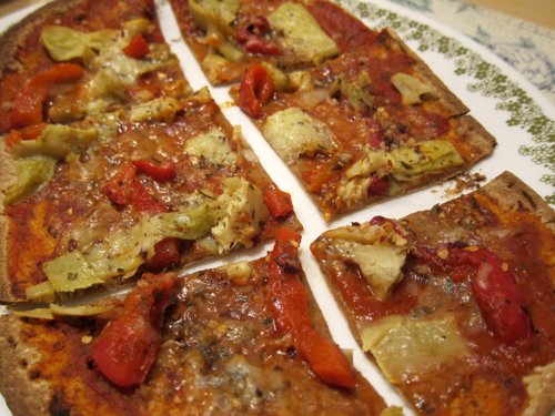 All my pizzas have these base ingredients: Flatout flatbread for the crust (this stuff is so great AND vegan), roasted red pepper, and pizza sauce (I really like the Safeway brand pizza sauce… and I am extremely sad that we will be losing our Dominick’s/Safeway stores in Chicago next month). I constructed the ‘za and baked it.